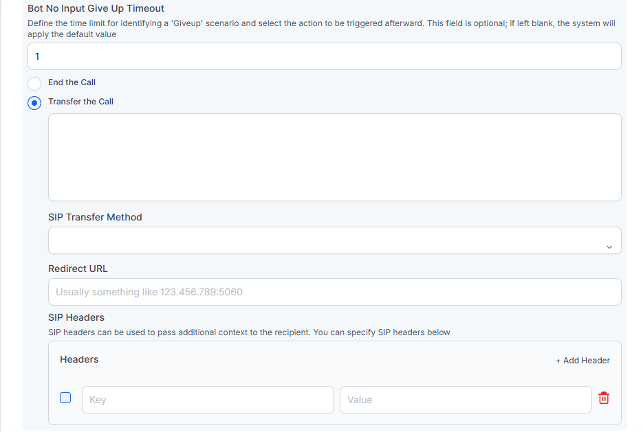 - Give-Up Action: End Call (message: "Bot not responding ending the call")