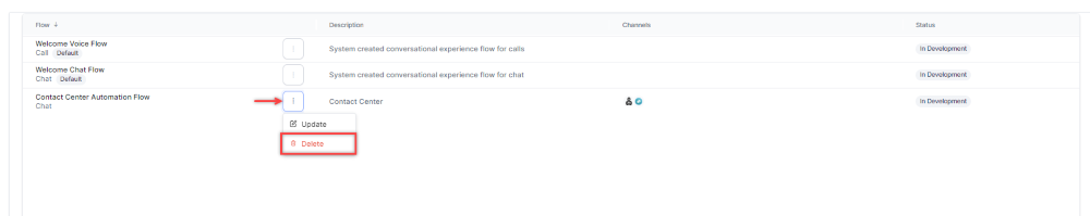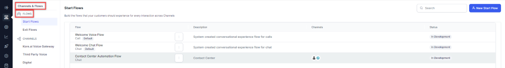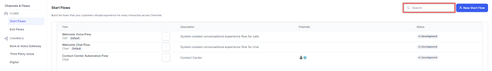 | Actions (⋮) | Displays the following icons: - View (Default Flows): Allows you to view the main configuration for the selected Start Flow entry (Name and Description). - Update: Allows you to update the main configuration for the selected Start Flow entry (Name, Description, and Channel). - Delete: Lets you remove the Start Flow entry. |
