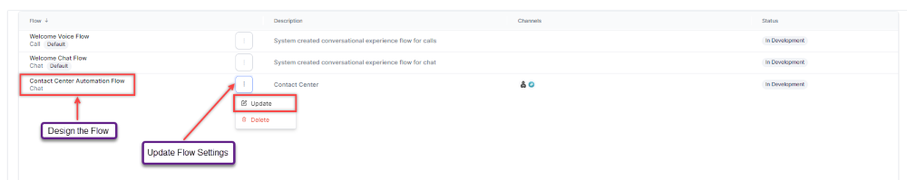 Click any Flow to access the Flow Designer and configure the selected entry and to update the Name, Description, or Channel of an entry, click Update.