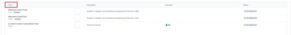 | Channels | Displays a list of channels attached to each flow and the flow types (call or chat). |
