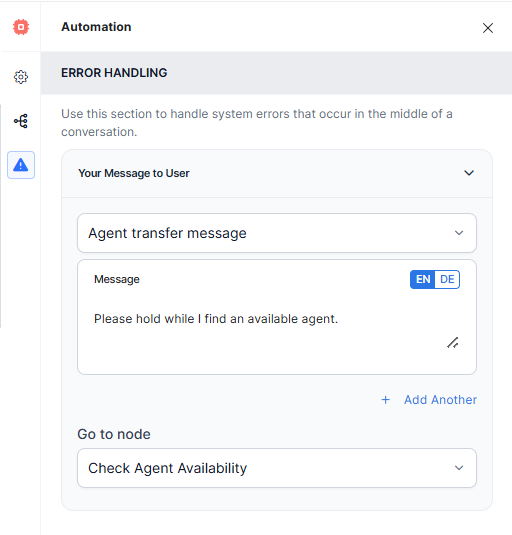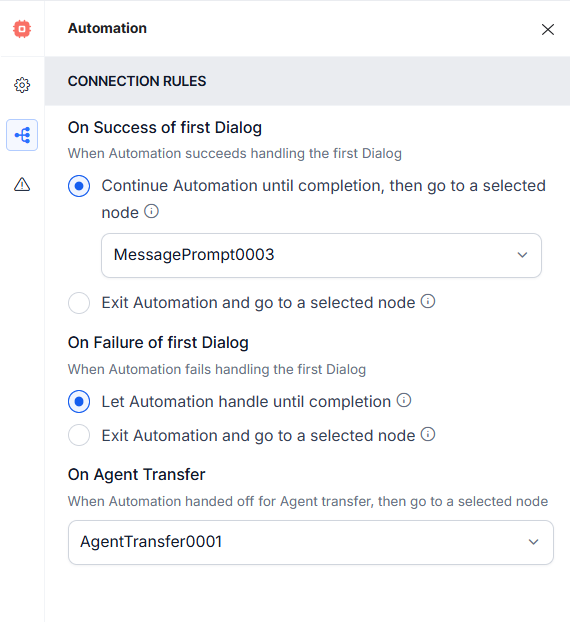 - On Agent Transfer: If automation has been handed off for agent transfer, select the node from the drop-down list to which you want to direct the flow.