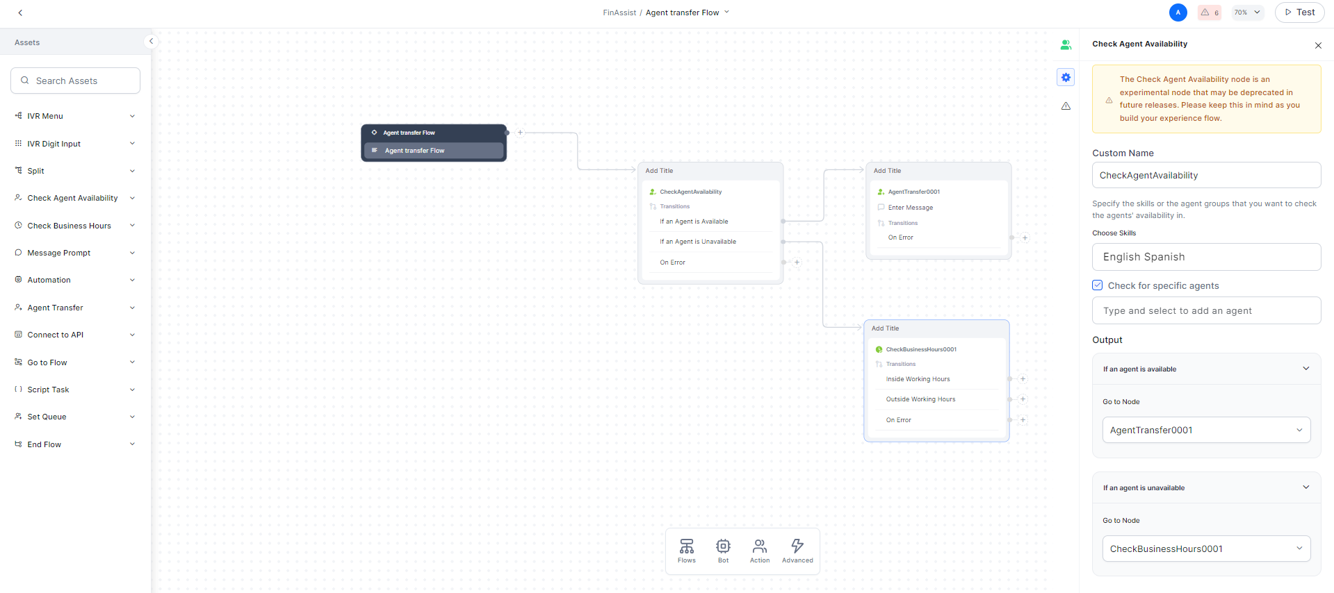This node checks agent availability based on skills and decides the next node to run within the experience flow.
