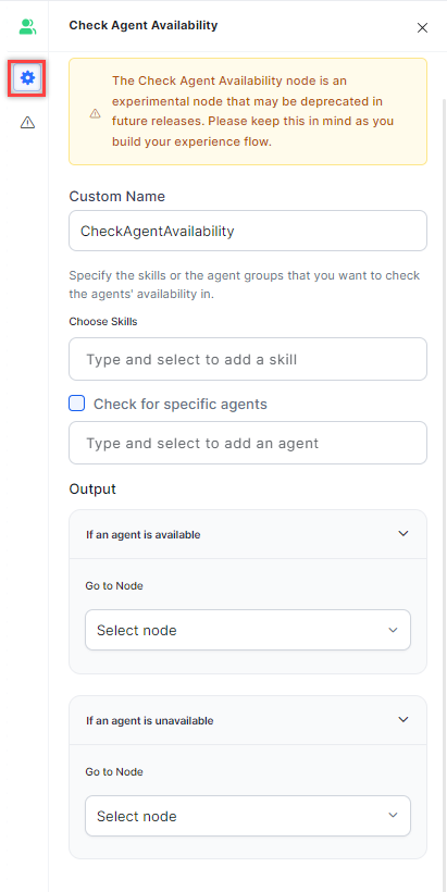 Please be aware that the Check Agent Availability node is experimental and may be deprecated in a future release.