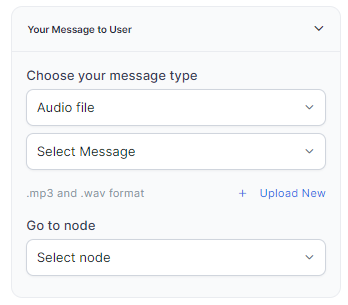- Audio File: You can type a new message to be played to the customer in the text field or click + Upload New to upload an audio file (.mp3 or .wav format) with the message to be played.