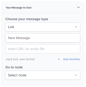 - Link: Click + Create New to add the text of the message you want to play to the customer and insert the URL of an audio file in .mp3 or .wav format. Click + Add Another to add another message URL.