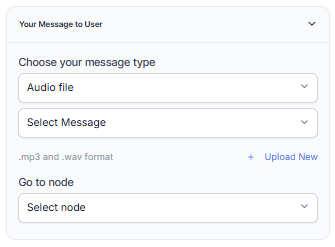 Audio File: Type a new message to be played to the customer or click + Upload New to upload an audio file (.mp3 or .wav format) with the message to be played.