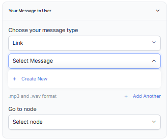 Link: Click + Create New to add the text of the message you want to play to the customer and insert the URL of an audio file in .mp3 or .wav format. Click + Add Another to add another message URL.
