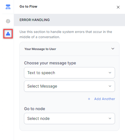 Go to node: Select the node to which you want to direct the error handling flow and define the system behavior. You can create a new node by selecting a node type or identifying and selecting an existing node.