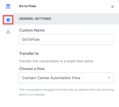 This node helps navigate from a parent to a target flow already built in a specific part of the customer interaction.