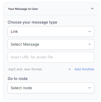 - Link: Click + Create New to add the text of the message you want to play to the customer and insert the URL of an audio file in .mp3 or .wav format. Click + Add Another to add another message URL.