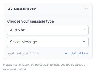 Audio File: In the text field, type a new message to be played to the customer or click + Upload New to upload an audio file (.mp3 or .wav format) with the message to be played.