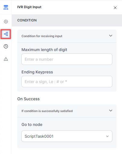 Conditions allow you to set the parameters based on which the digit input is recorded. Click the Condition icon to define the input conditions by providing values for the following fields: