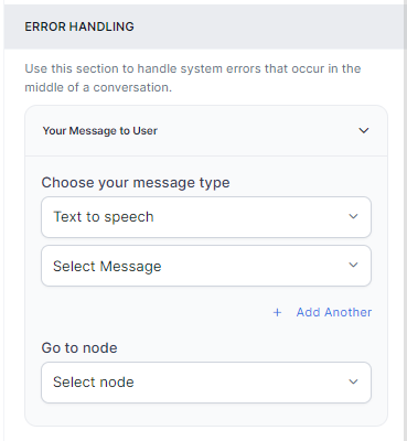 - Your Message to User: Choose the message type from Text to Speech, Link, or audio; then, type the message, upload an audio file (mp3 and .wav formats are only supported for audio files), or provide a URL to the error message that will be played out to the caller when a system error occurs. See General Settings for a detailed explanation of these features.