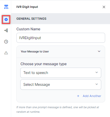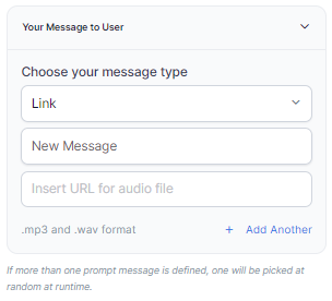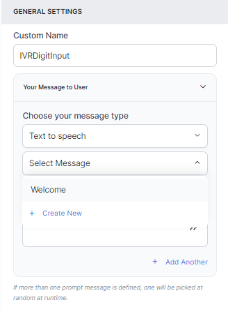 - Define multiple message types for the prompt message to be played to the customer by clicking + Add Another. In this case, one message will be randomly selected and played during runtime.