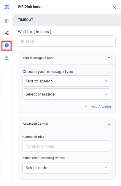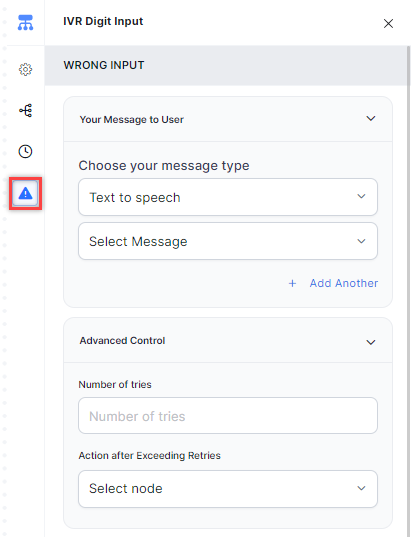 - Under Advanced Control > Action after Exceeding Retries, select the node to direct the flow after the wrong input retries have exceeded. Select a node type to create the node or identify and select an existing node.