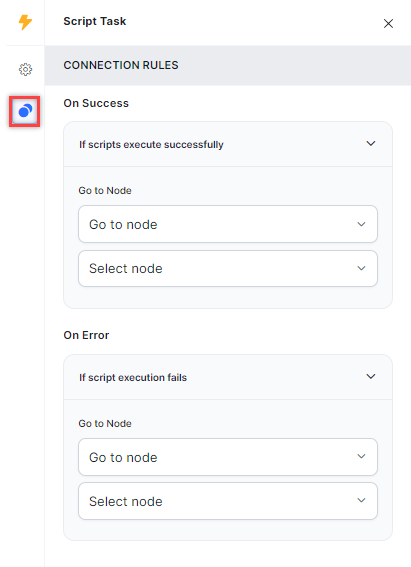 Click the Connection Rules icon and select the Go to node you want the node to trigger when the script is successful or fails.