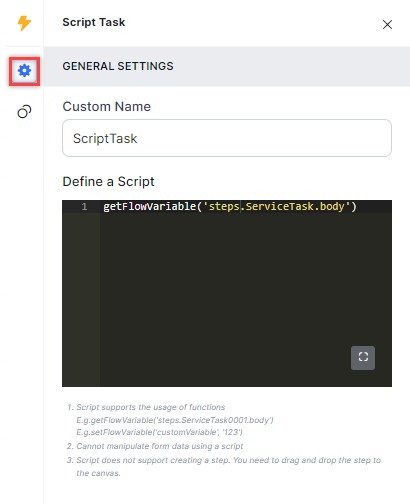 - The script node does not support creating a step in the flow. This has to be explicitly designed on the canvas.