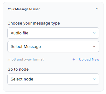 - Audio File: You can type a new message to be played to the customer in the text field or click + Upload New to upload an audio file (.mp3 or .wav format) with the message to be played;