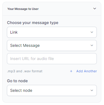 - Link: Click + Create New to add the text of the message you want to play to the customer and insert the URL of an audio file in .mp3 or .wav format. Click + Add Another to add another message URL.