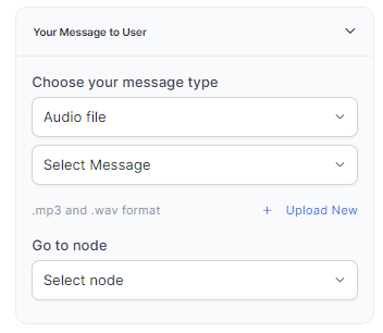 - Audio File: In the text field, type a new message to be played to the customer or click + Upload New to upload an audio file (.mp3 or .wav format) with the message to be played.
