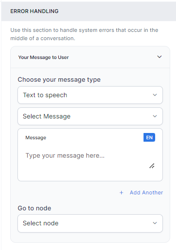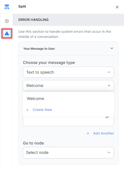 Go to node: Select the node to which you want to direct the error handling flow and define the system behavior. You can create a new node by selecting a node type or identifying and selecting an existing node.