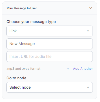 - Link: Click + Create New to add the text of the message you want to play to the customer and insert the URL of an audio file in .mp3 or .wav format. Click + Add Another to add another message URL.