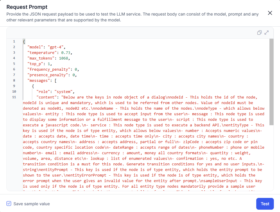 - On the request prompt pop-up, enter the test payload and click Test to check the connection. You can also save the test payload using the check box.