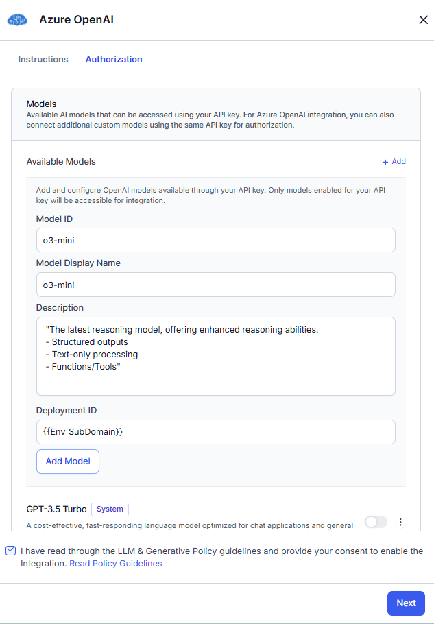 For example, Azure OpenAI. On the authorization tab, go to the Models section and click + Add. Enter the Model ID, Model Display Name, model Description, Deployment ID, then click Next. If you want to add more models, repeat the step.
