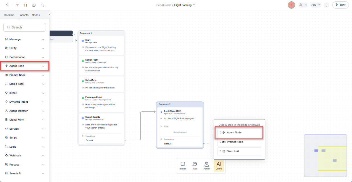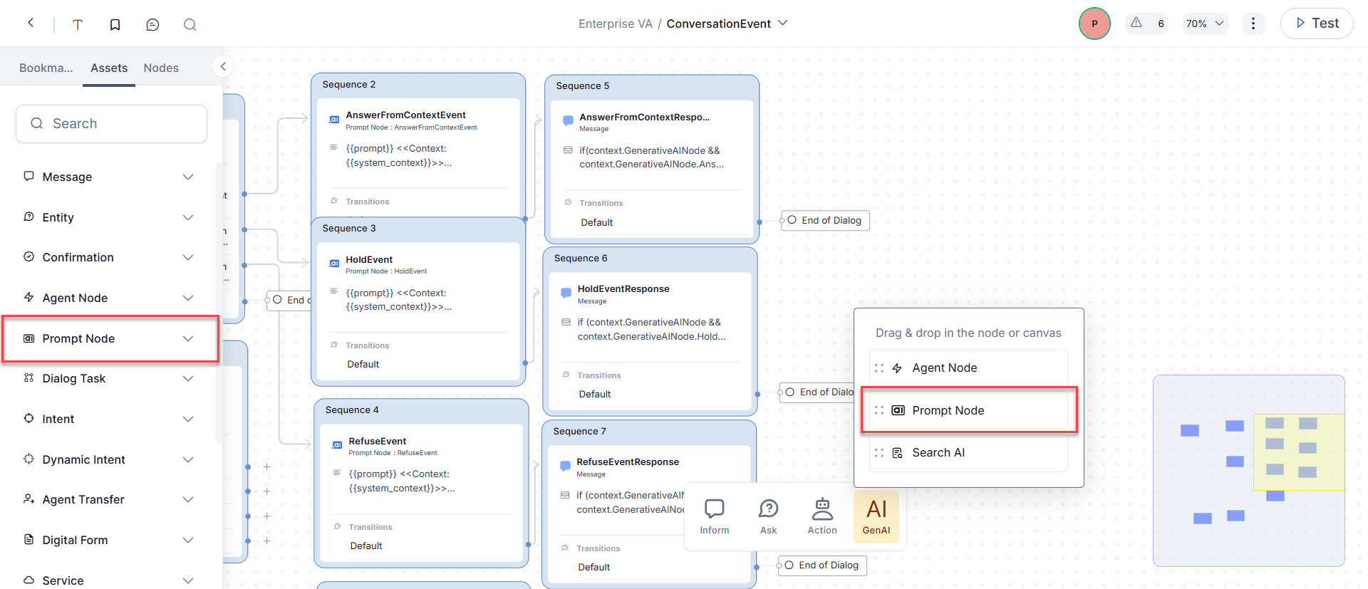 When building the Dialog Flow, click the Gen AI, and select the Prompt Node node.