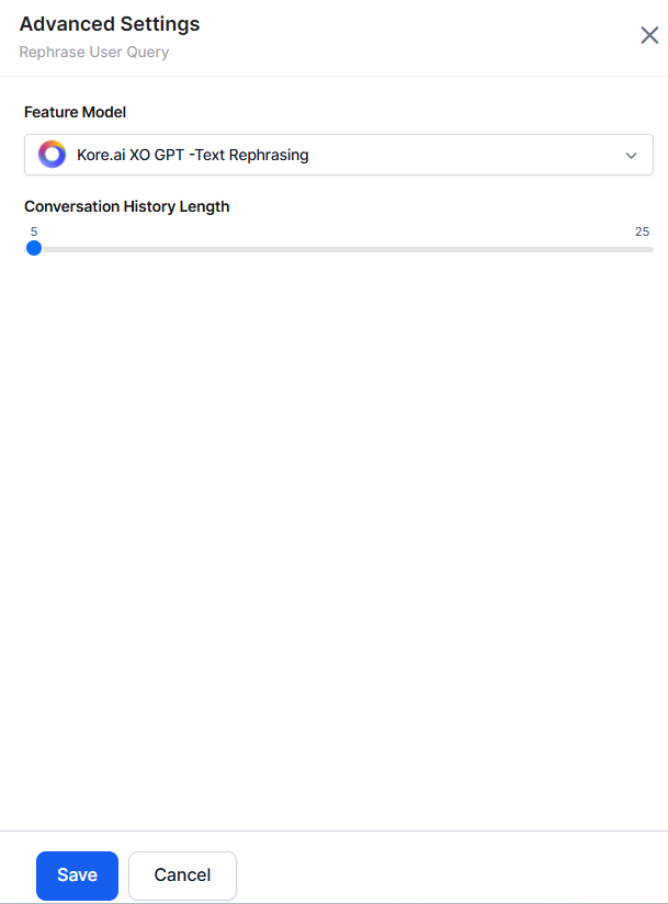 This setting allows you to specify the number of recent messages sent to the LLM as context for the user query rephrasing feature. These messages include both user messages and an AI Agent messages. The default value is 5. However, the number of messages sent is limited to the session's conversation history, even if your set value is higher. You can access the Conversation History Length from Rephrase User Query > Advanced Settings.
