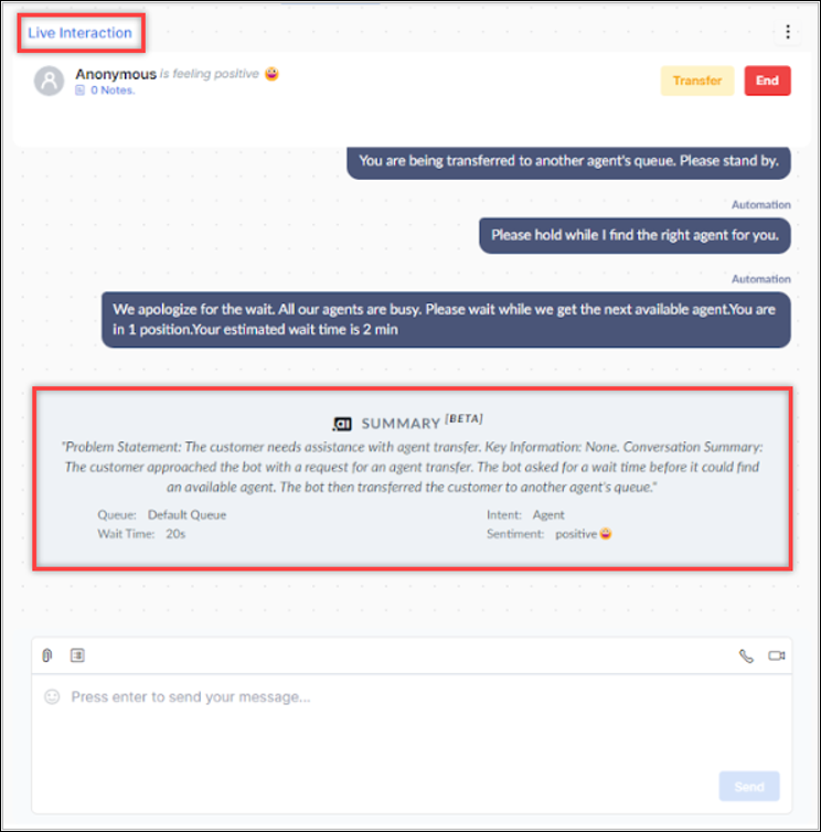 In a contact center environment, the customer interacting with an AI Agent may request to transfer to a live agent. During agent handoff, the agent must have the necessary context information and interaction history to assist the customers efficiently. The system generates the conversation transcript and interaction summary and routes it to the agent for better understanding.