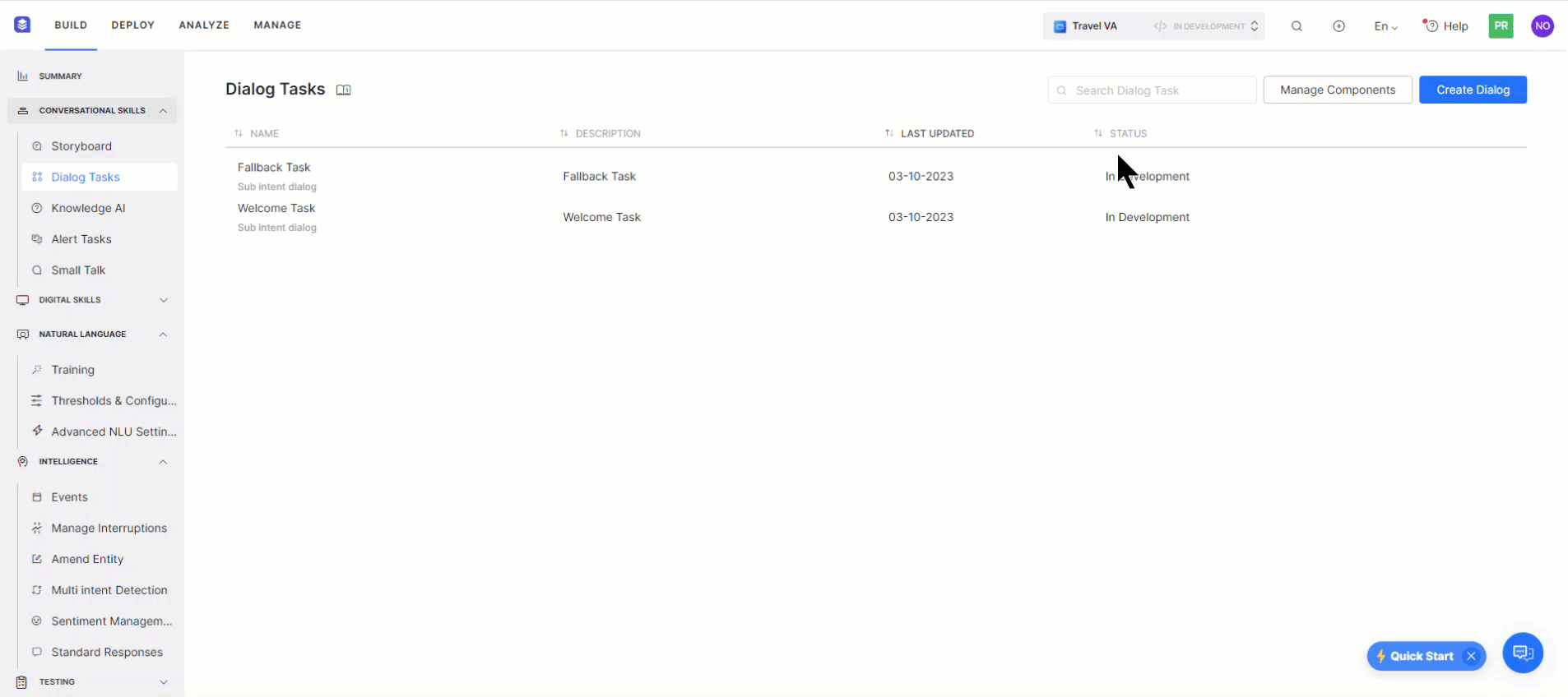 This feature auto generates conversations and dialog flows in the selected language using the VA’s purpose and intent description provided (in English or the selected Non-English App Language) during the creation process. The Platform uses LLM and generative AI to create suitable Dialog Tasks for Conversation Design, Logic Building & Training by including the required nodes in the flow.