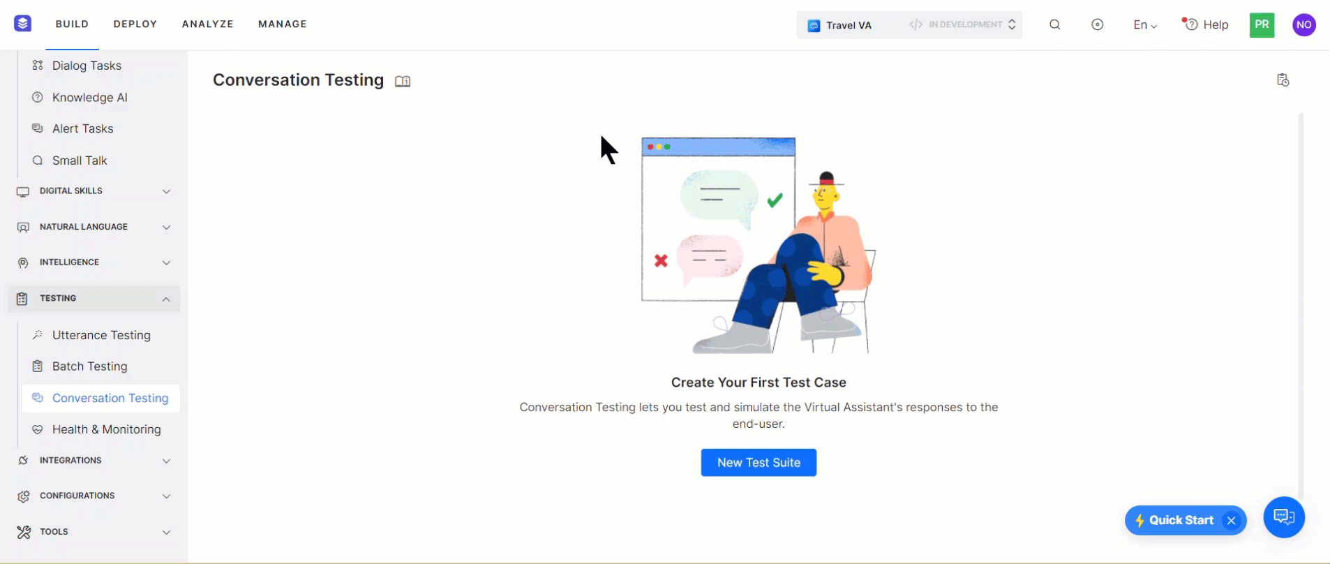 This feature provides a regression tool or a Playbook that creates a conversation test suite for each intent (new and old) in English or Non-English App language to evaluate the impact of the change on the conversation execution.