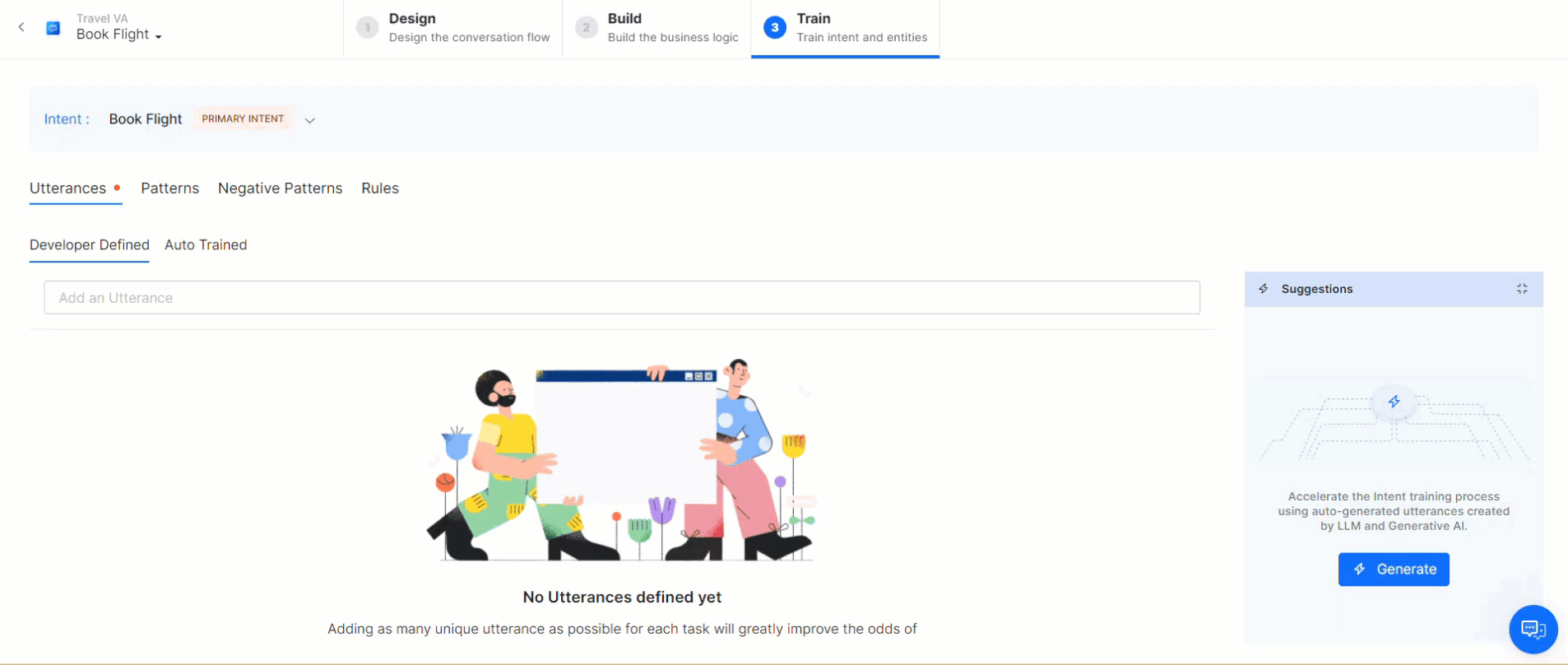 This feature generates a list of suggested training utterances and NER annotations based on the selected NLU language for each intent description and Dialog Flow, eliminating the need for manual creation.
