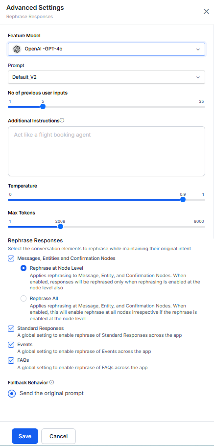 - Rephrase All: Applies rephrasing to all Message, Entity, and Confirmation nodes, regardless of their individual settings. If a node doesn’t have specific settings, the system uses the global or feature-level advanced settings such as model and prompt. Nodes with defined configurations continue to use their assigned settings.
