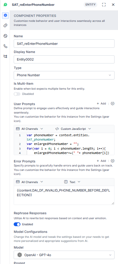 - Messages, Entities, and Confirmation Nodes: Allows you to enable or disable rephrasing.