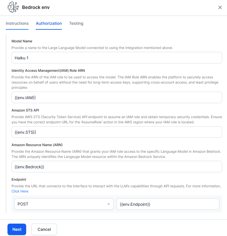 | Amazon Bedrock | IAM Role ARN, Amazon STS API, Amazon Resource Name (ARN), Endpoint, Headers(optional) |