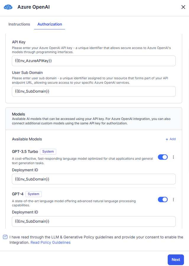 | Azure OpenAI | API Key, User Sub-Domain, Deployment ID |