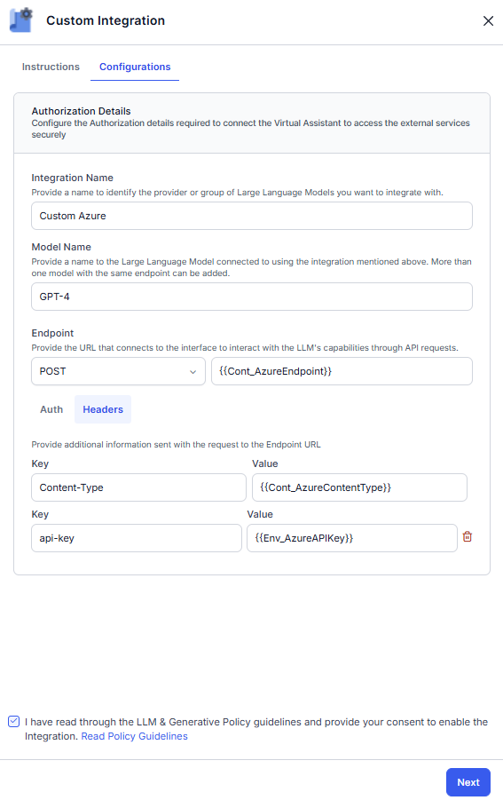 The Endpoint specifies the API URL for the LLM. The Authorization field defines the authentication method or credentials. The Headers field includes any additional key-value pairs required for the request. |