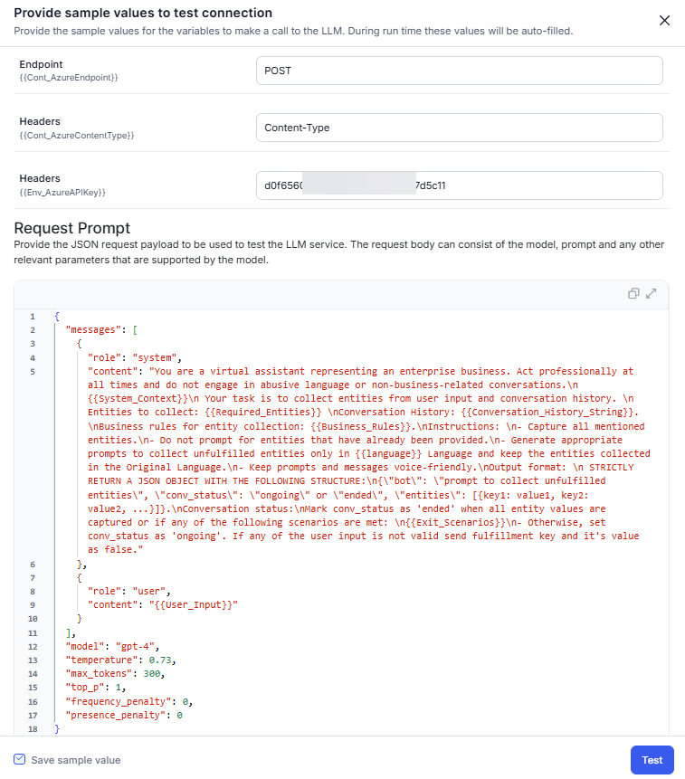 In the next step, enter the sample values in the Test Connection pop-up. You can select the checkbox to save these values for future use.