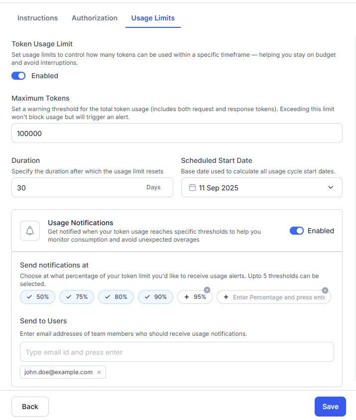 - Maximum Tokens: Set the token usage limit for notification purposes. Exceeding this limit won't block usage but will trigger an alert.