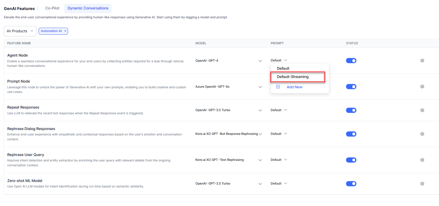 The Platform provides Default-Streaming prompts in addition to default (non-streaming) prompts for Agent Node and Prompt Node only for the OpenAI models.