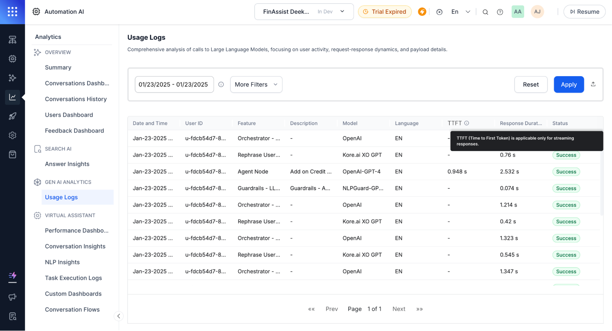 As part of the Platform's Analytics module updates, the enhancements better tracks and differentiate streaming and non-streaming responses. The LLM Usage Logs main screen now includes a new column called "TTFT" (Time to First Token), which applies only to streaming responses. Additionally, the Detailed Log page now includes a Response Type field to indicate whether a response is streaming or non-streaming, offering more precise insights into response behavior.