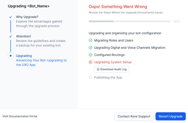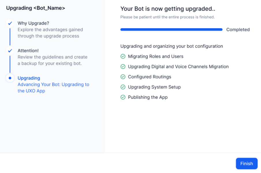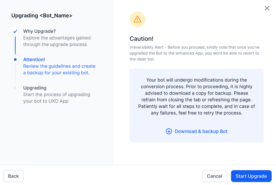 Review the guidelines, download and backup your Agent AI bot, and click Start Upgrade.