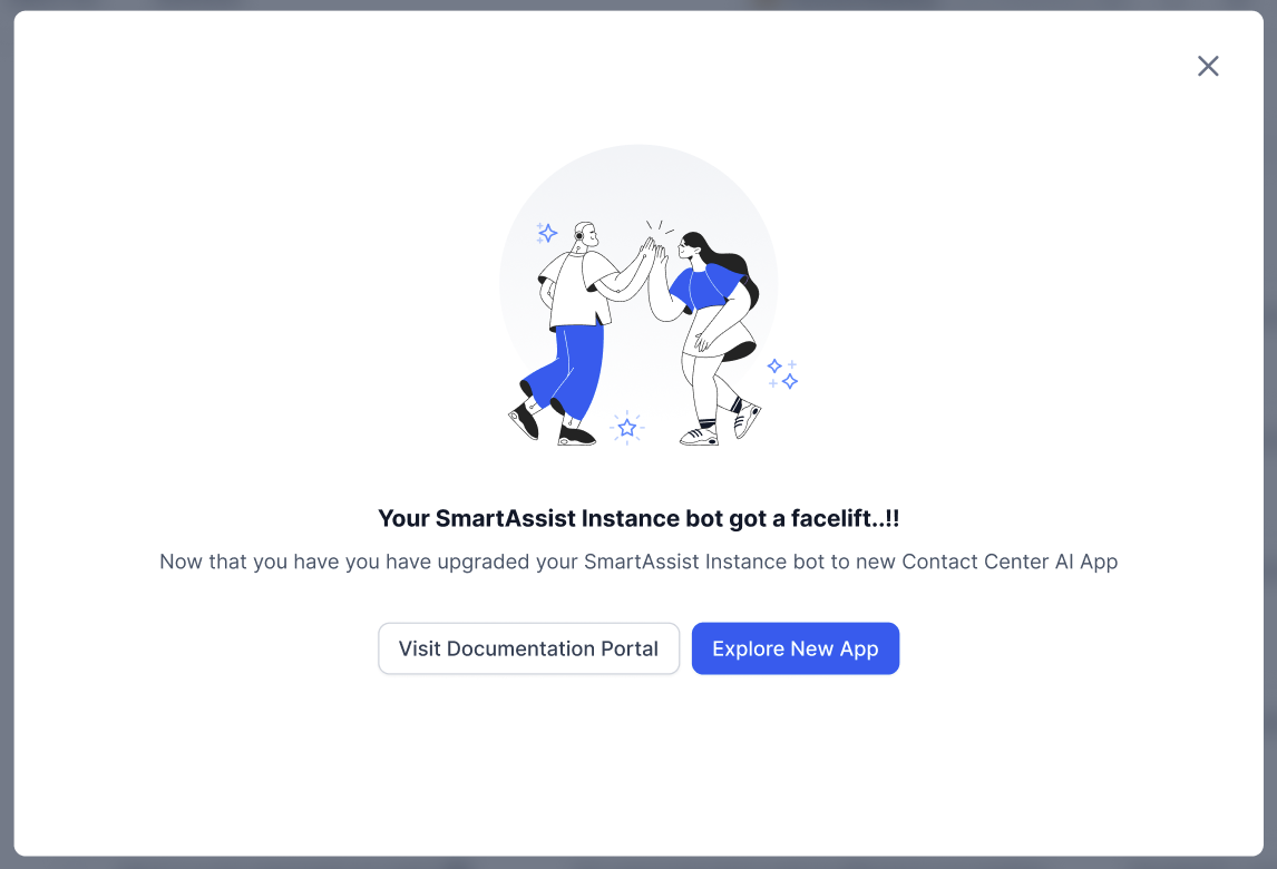 When upgrading an account associated with SmartAssist, the instance bot does not initially appear in XO v11. Contact the Support team, to execute a migration script to make the instance bot visible in XO v11 for that account. Afterward, the instance bot must be upgraded, which then becomes the Contact Center AI instance. At this stage, the SmartAssist configurations are properly migrated to Contact Center AI.