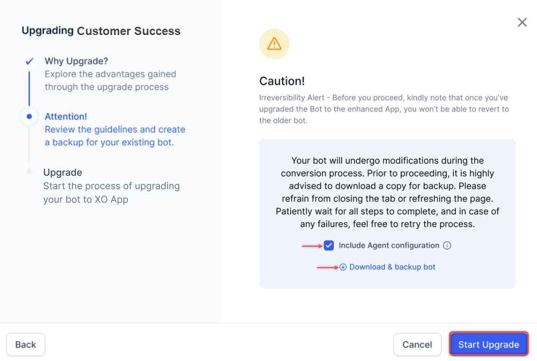 The system selects the Include Agent Configuration checkbox by default. It includes agent profile data, agent group assignments, agent-to-skill mappings, agent-to-experience flows, and agent-to-queue mappings. Select Download & backup your bot, and select Start Upgrade. The system downloads the following configuration data:
