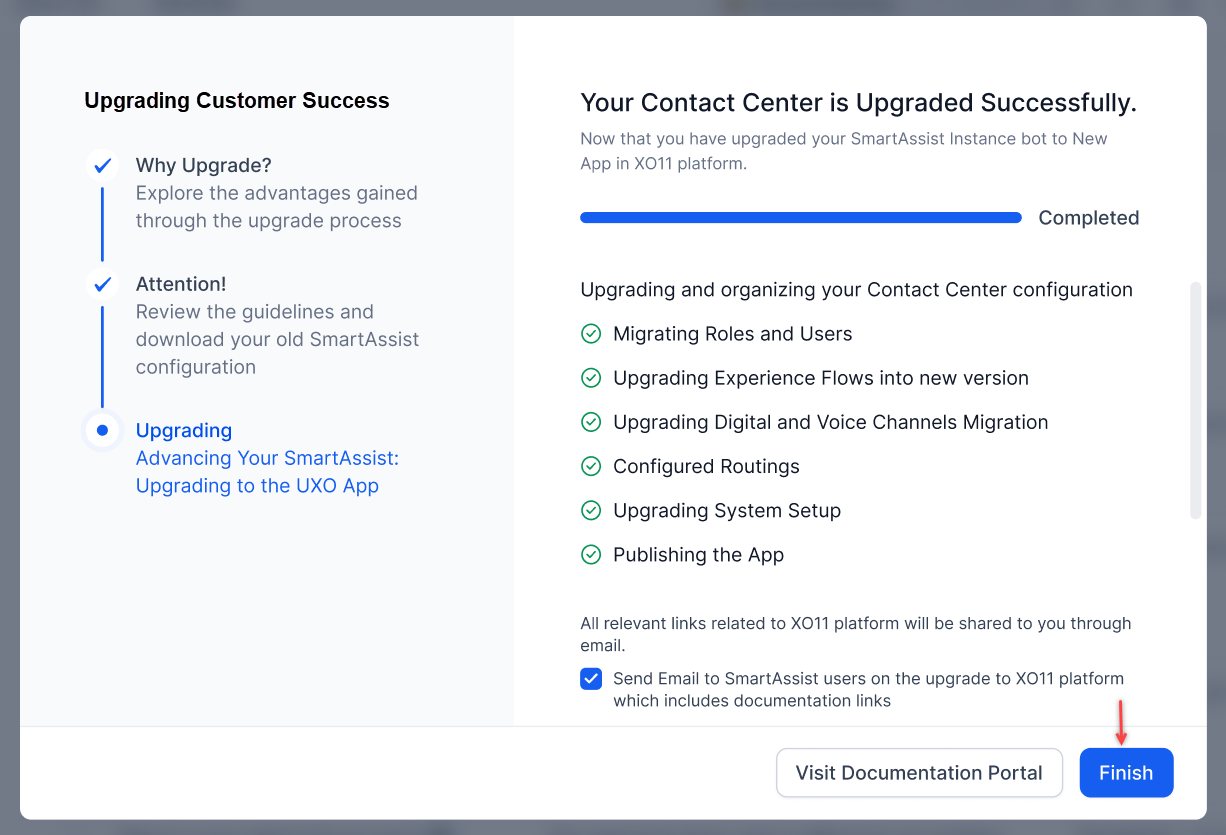 The system selects the Send Email to SmartAssist users option by default. When the app owner selects Finish, the system sends an email to tell users about the upgrade. Selecting Visit Documentation Portal redirects the user to the XO v11 documentation page.