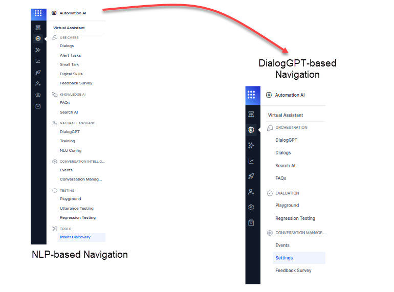 - Small Talk, Digital Skills, and Alert Tasks are moved under Conversation Management > Settings.
