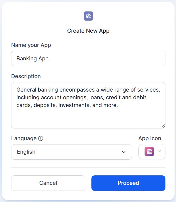 Enter your App's Name and provide a brief Description of what it does. Select the Language and App Icon from the dropdown.