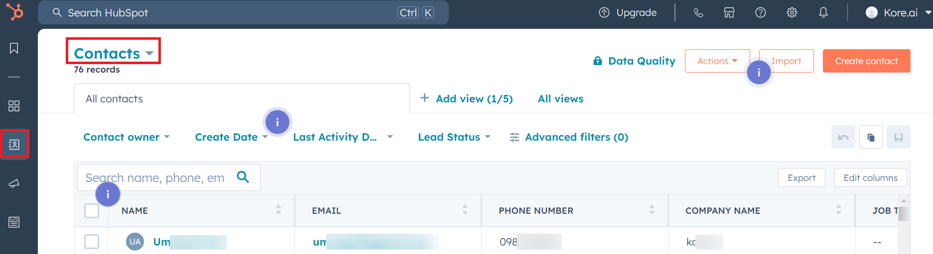 The new lead is created in HubSpot CRM. To view the lead, log in to HubSpot, click CRM in the left menu bar, and then select Contacts.